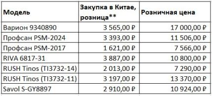 Рассмотрим сводную табличку для моделей, у которых в Китае обнаружены клоны. Мы внимательно рассматривали каждую копию и проверяли комплектации, прежде чем указать цену закупки. Тем не менее, этот подход все же не гарантирует желаемой точности. По этой причине цена закупки в таблице оценочна.