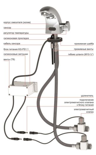 В смесителе используется инфракрасный сенсор с автоматической настройкой при первом включении электропитания. Возможна и дистанционная настройка с помощью пульта KG000 RC (в комплект не входит).