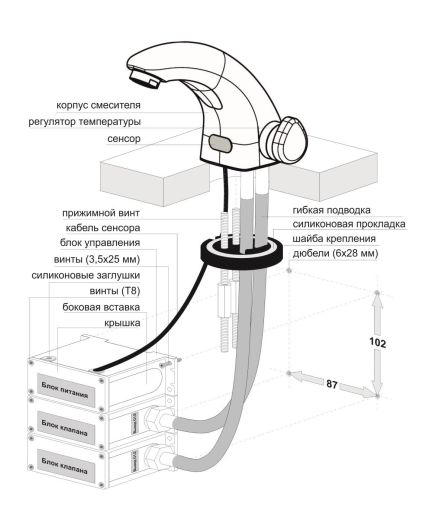 - При срабатывании сенсора горячая и холодная вода поступают через электро-магнитные клапаны и гибкую подводку на смешиватель (находится внутри корпуса смесителя).