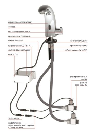 В смесителе используется инфракрасный сенсор с автоматической настройкой при первом включении электропитания. Возможна и дистанционная настройка с помощью пульта KG000 RC (в комплект не входит).