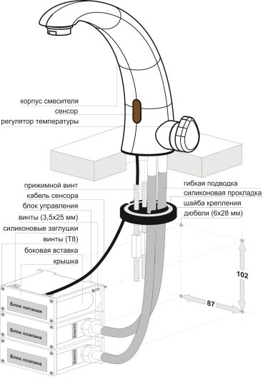 - При срабатывании сенсора горячая и холодная вода поступают через электро-магнитные клапаны и гибкую подводку на смешиватель (находится внутри корпуса смесителя).
