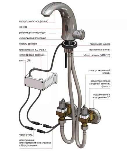 В смесителе используется инфракрасный сенсор с автоматической настройкой при первом включении электропитания. Возможна и дистанционная настройка с помощью пульта KG000 RC (в комплект не входит).