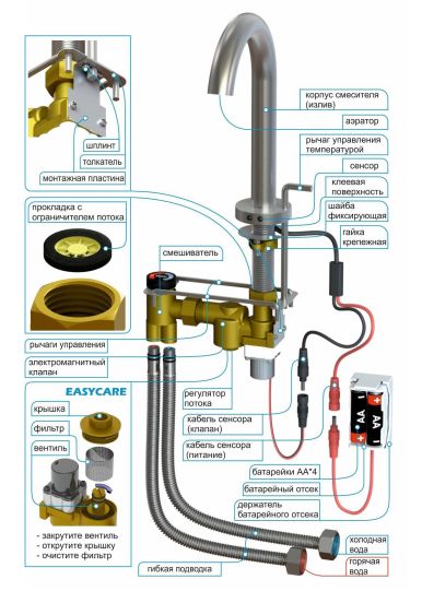 Встроенный в электромагнитный клапан фильтр легко промыть, благодаря технологии EasyCare . Нержавеющая сталь SUS304, из которой сделан корпус смесителя, позволяет использовать для ухода за изделием даже агрессивные, хлорсодержащие моющие средства и антисептики.