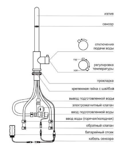- Электромагнитный клапан открывается и подает воду в излив смесителя после того, как рука появится в поле зрения сенсора.