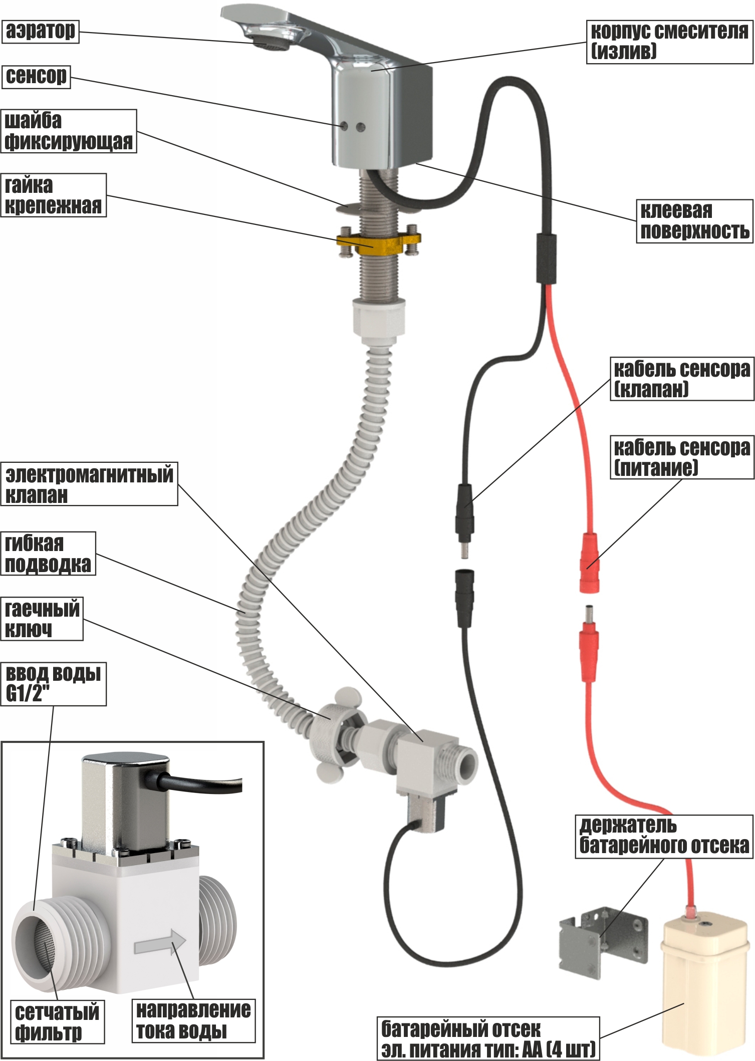 - Электромагнитный клапан открывается и подает воду в излив смесителя после того, как рука появится в поле зрения сенсора.