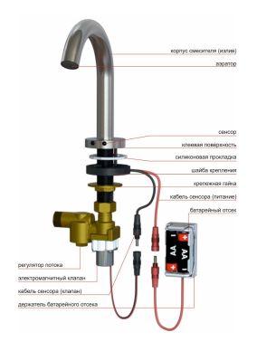 - Электромагнитный клапан открывается и подает воду в излив смесителя после того, как рука появится в поле зрения сенсора.