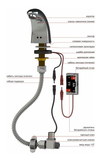 - Электромагнитный клапан открывается и подает воду в излив смесителя после того, как рука появится в поле зрения сенсора.