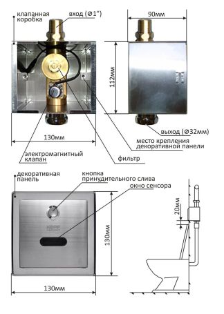 - Слив происходит однократно и при условии, что человек находится в зоне действия сенсора (40 - 70 см) более 8 секунд, спустя 2 секунды после его ухода.